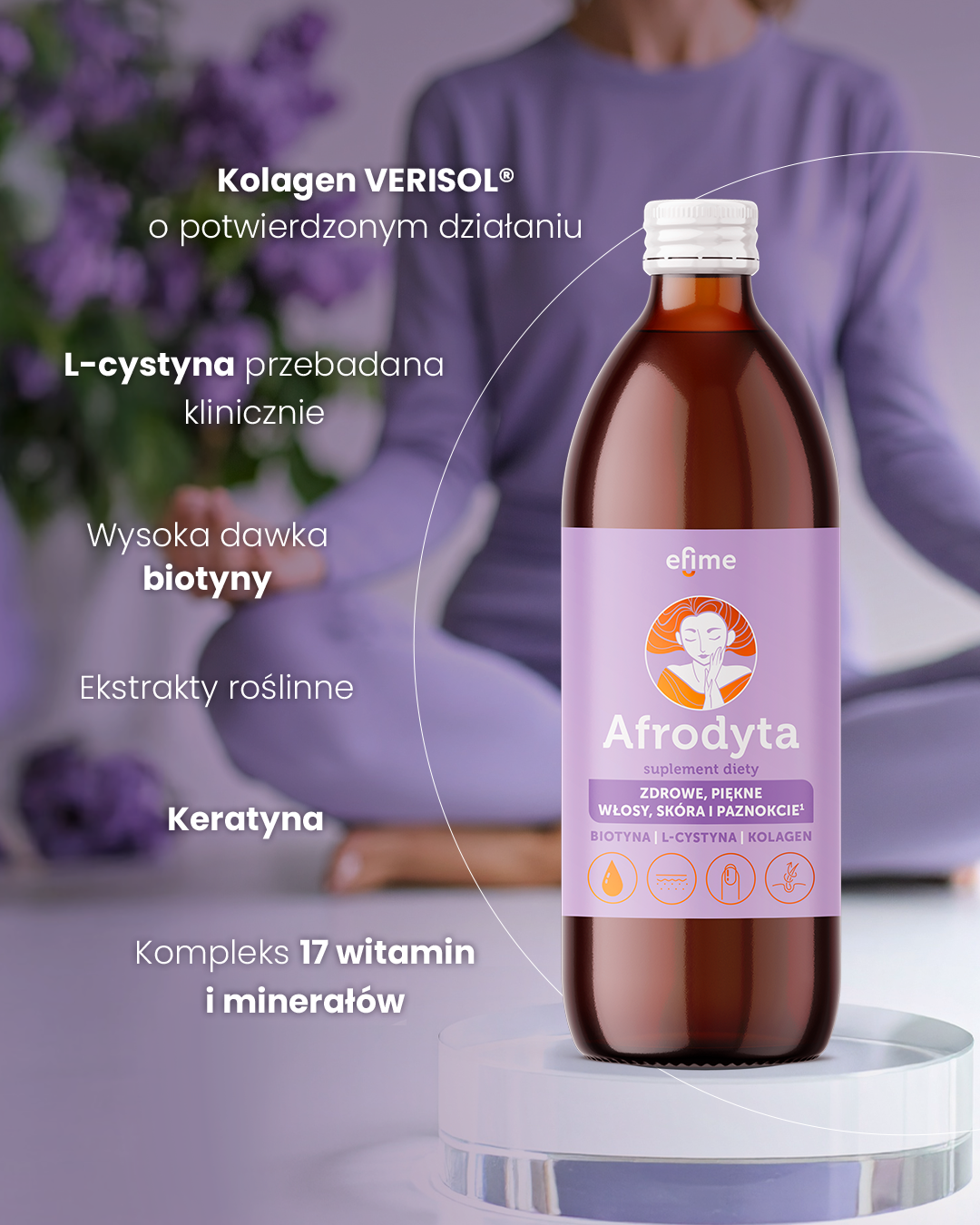 Efime Afrodyta w płynie to zaawansowana formuła aż 23 składników, stworzona specjalnie dla kobiet. W porcji dziennej zawiera aż 2500 mg kolagenu Verisol®, 1000 mg L-cystyny i 100 mg hydrolizatu keratyny, 2500 μg biotyny oraz kompleks witamin i minerałów.
