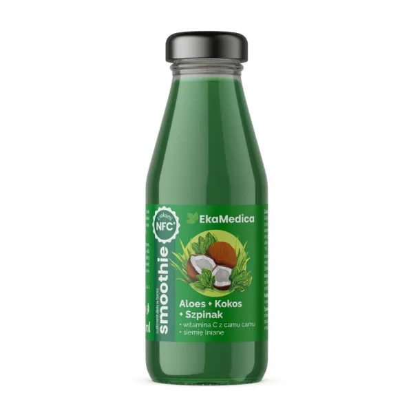 Aloes – kokos – szpinak - suplement diety w płynie w formie smoothie na bazie soków i przecierów owocowych z dodatkiem siemienia lnianego i ekstraktu z owoców camu camu. Pasteryzowany. Bez dodatku cukru – zawiera naturalnie występujące cukry.