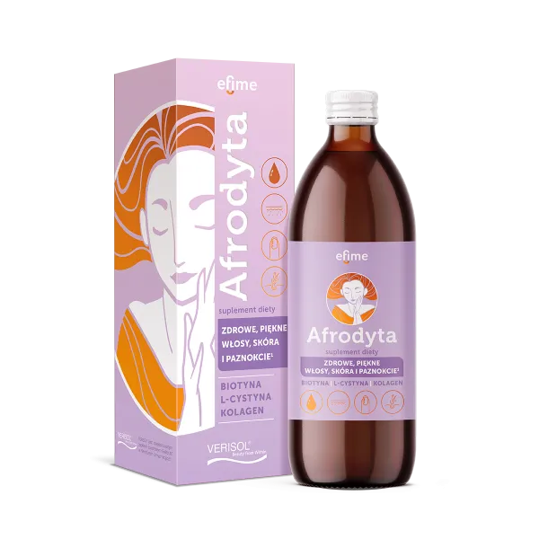 Efime Afrodyta w płynie to zaawansowana formuła aż 23 składników, stworzona specjalnie dla kobiet. W porcji dziennej zawiera aż 2500 mg kolagenu Verisol®, 1000 mg L-cystyny i 100 mg hydrolizatu keratyny, 2500 μg biotyny oraz kompleks witamin i minerałów.